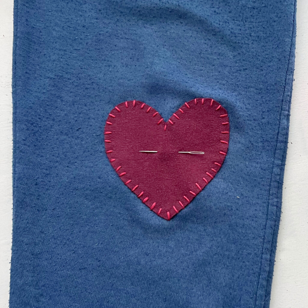 • Naai bij een grote (knie)lap ook nog een paar keer over de applicatie heen, van links naar rechts, met een rechte steek. Voor wat extra stevigheid.