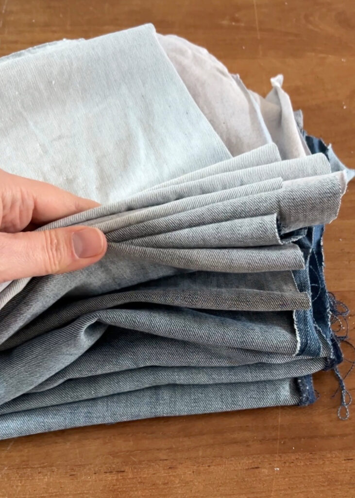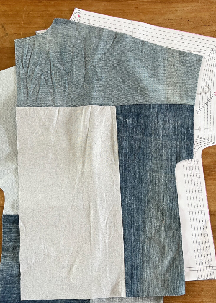 Daarna naaide ik steeds 3 lappen stof aan elkaar, om stukken stof te krijgen die groot genoeg waren om de patroondelen van het naaipatroon op te leggen. Ik gebruikte de voorkant en achterkant van de broekspijpen, om zoveel mogelijk tinten blauw te krijgen.