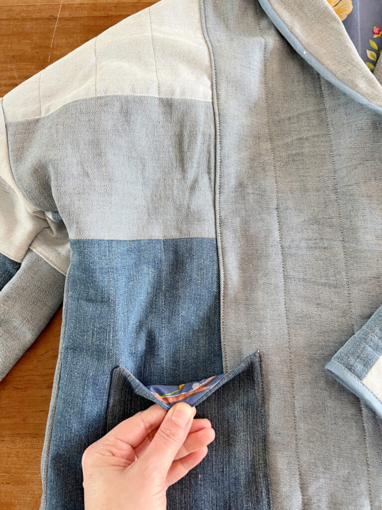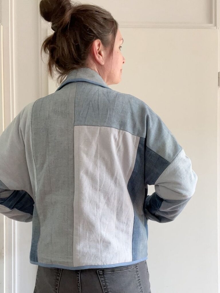 De buitenkant van de jas is helemaal doorgestikt op een dunne bamboe quiltvoering. Daarna schuif je de voering in de jas en werk je de stofranden af met biaisband.