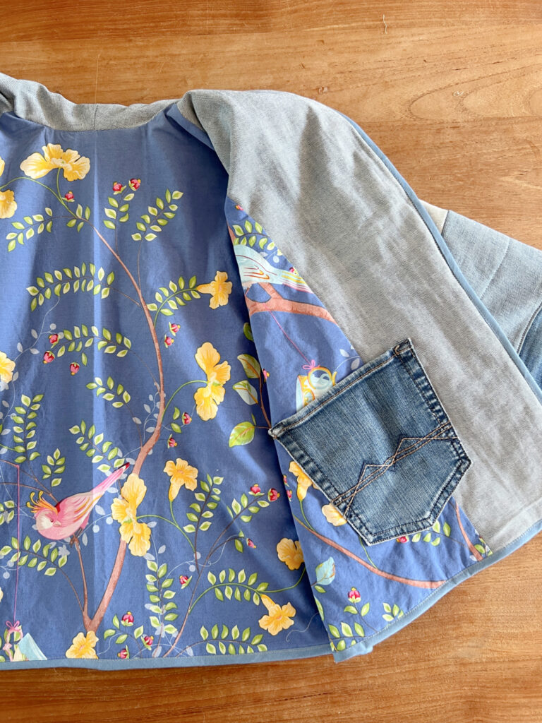 Dus ik ging aan de slag met de stof van oude spijkerbroeken en maakte er een gevoerd jasje van! Met als voering een leuk bloemetjes dekbedovertrek, dat ik ook ooit eens gekregen had om te hergebruiken.